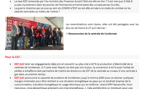 Rappelons que le projet ECOCOMBUST 2 est porté par les agents avec la CGT seule . Les OS sont bien timorées sur la situation du thermique à flamme en France et surtout à EDF. Rien nest dit ou encore écrit par EDF sur la conservation du statut pour les agents. Au […]