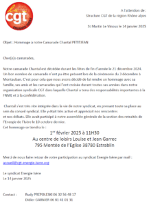 Notre camarade Chantal PETITJEAN nous a quitté le 21 décembre 2024 après une vie de militantisme engagé dans la CGT consacrée à la défense des salariés notamment dans l’égalité Femme/Homme. Son syndicat ainsi que la fédération lui rendent hommage le 1 er février sur ses terres d’accueil : 1er février 2025 à 11H30